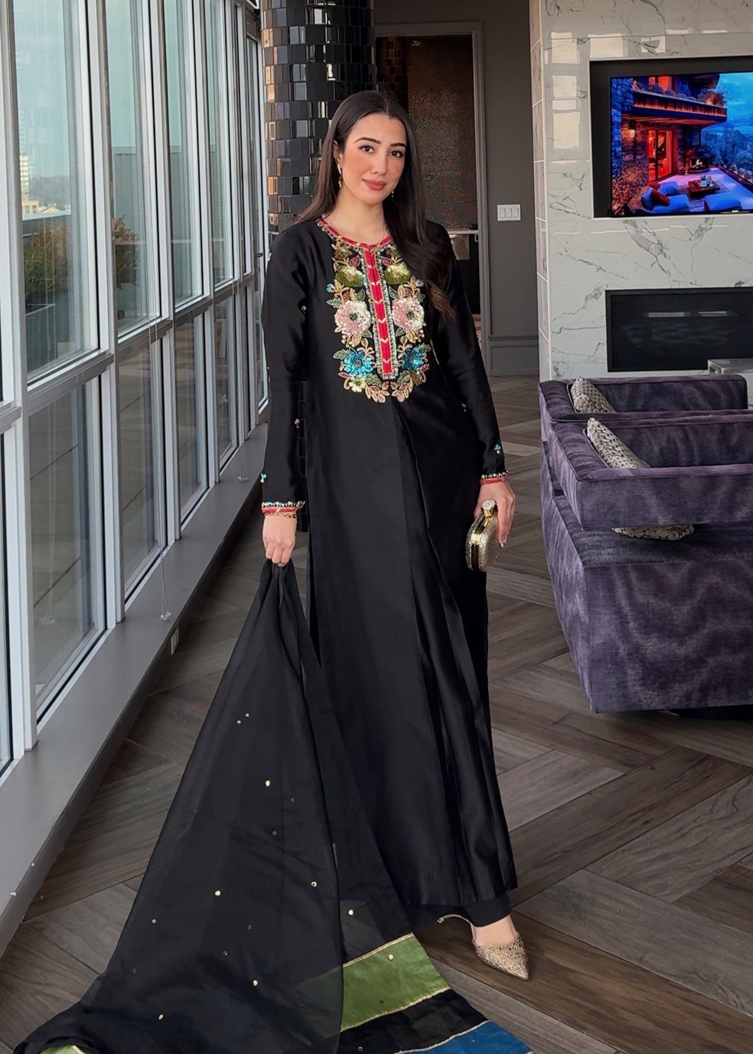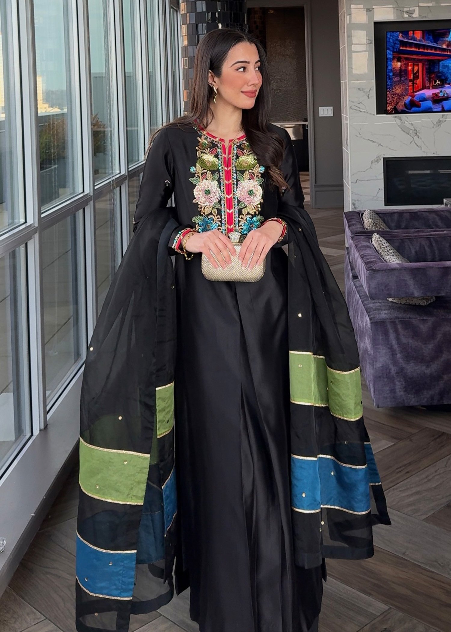 Product Description: Introducing Marjaan, a breathtaking creation that embodies grace and grandeur. Designed to captivate, this ensemble is adorned with intricate hand embellishments, featuring the rich artistry of naqshi and dabka, dazzling sequins, and pearls. Accentuated by a sparkling rhinestone chain and the delicate beauty of resham threads, Marjaan is a perfect blend of tradition and sophistication. Let Marjan be your statement of elegance, crafted for moments that deserve to be cherished forever.