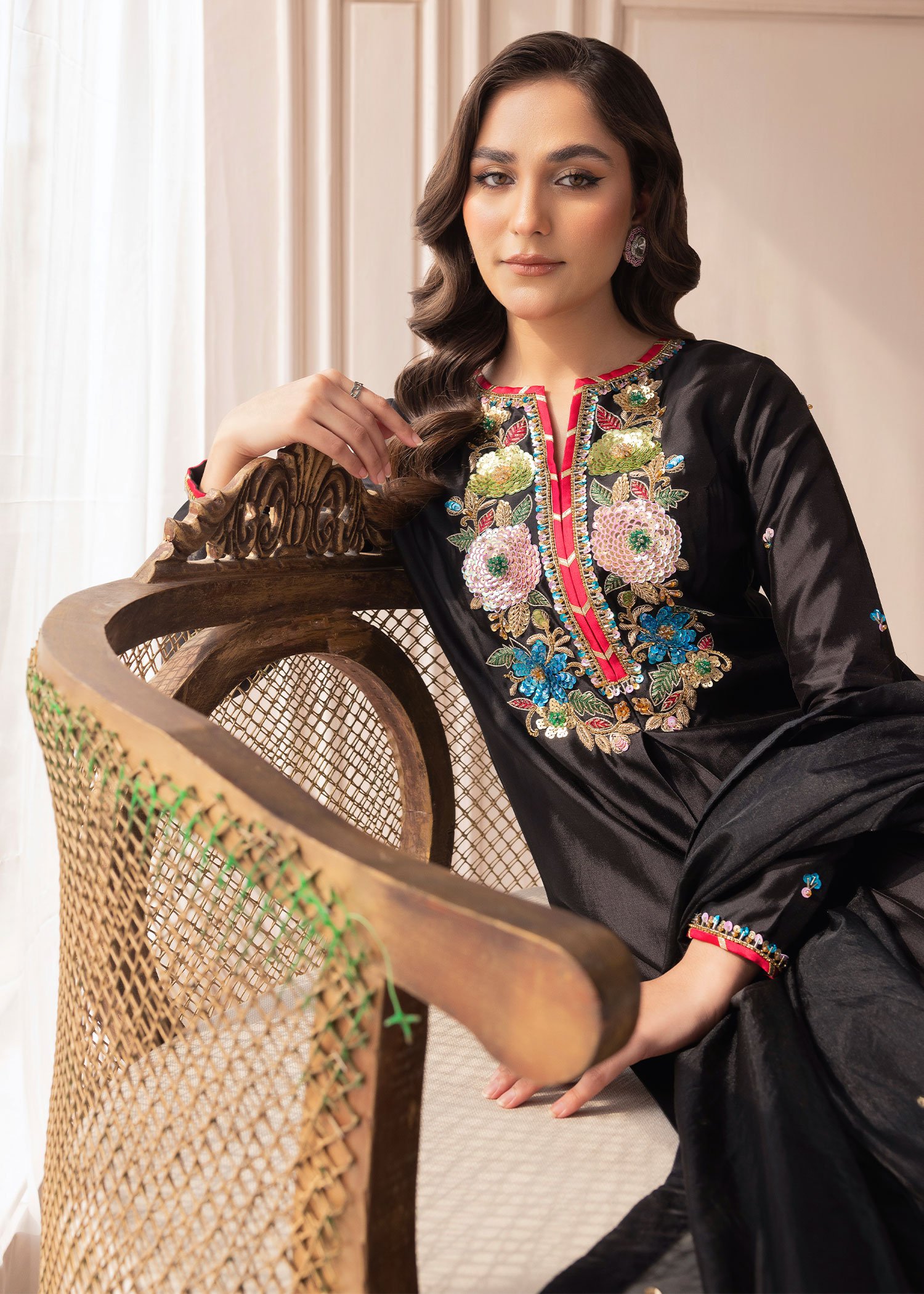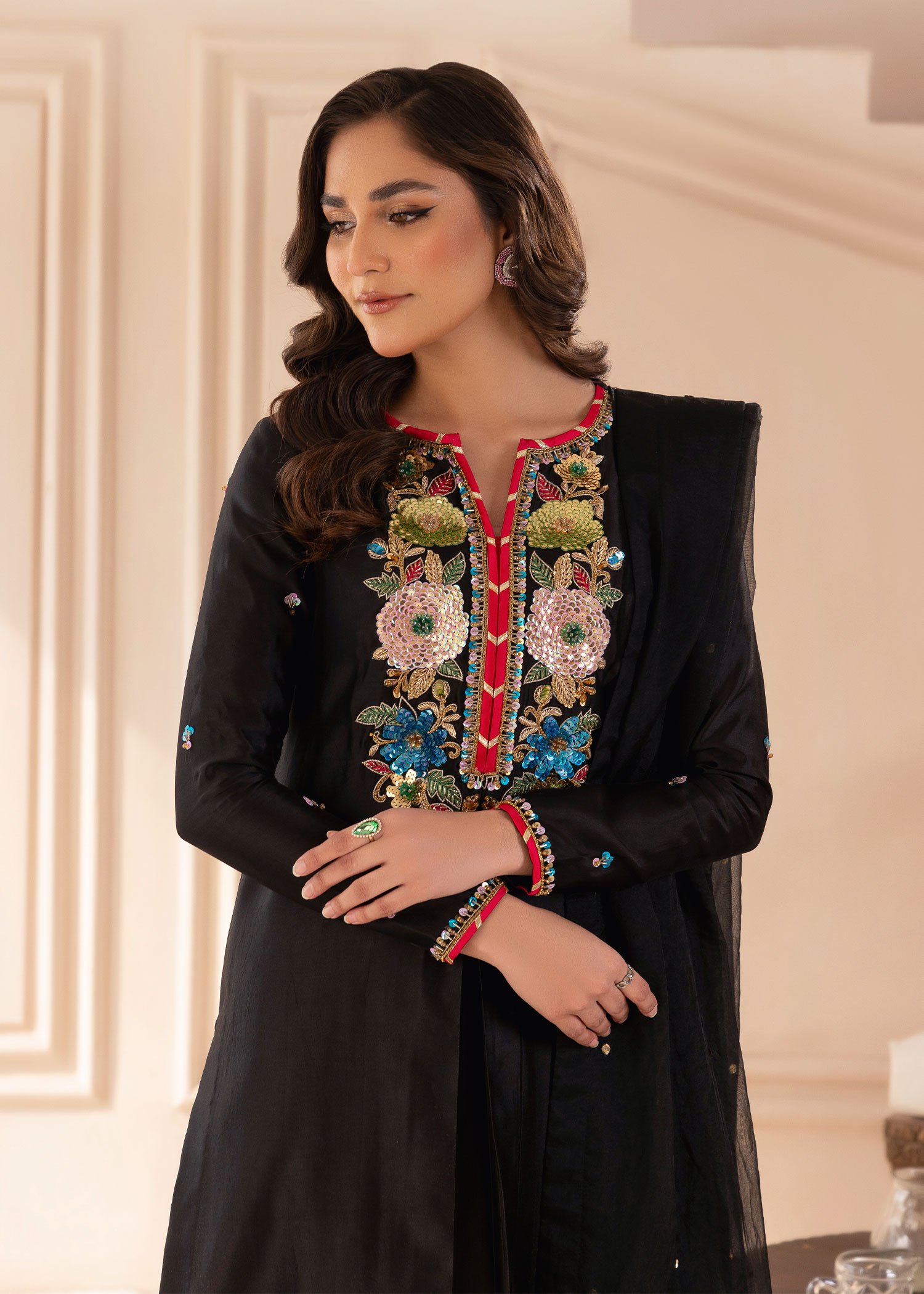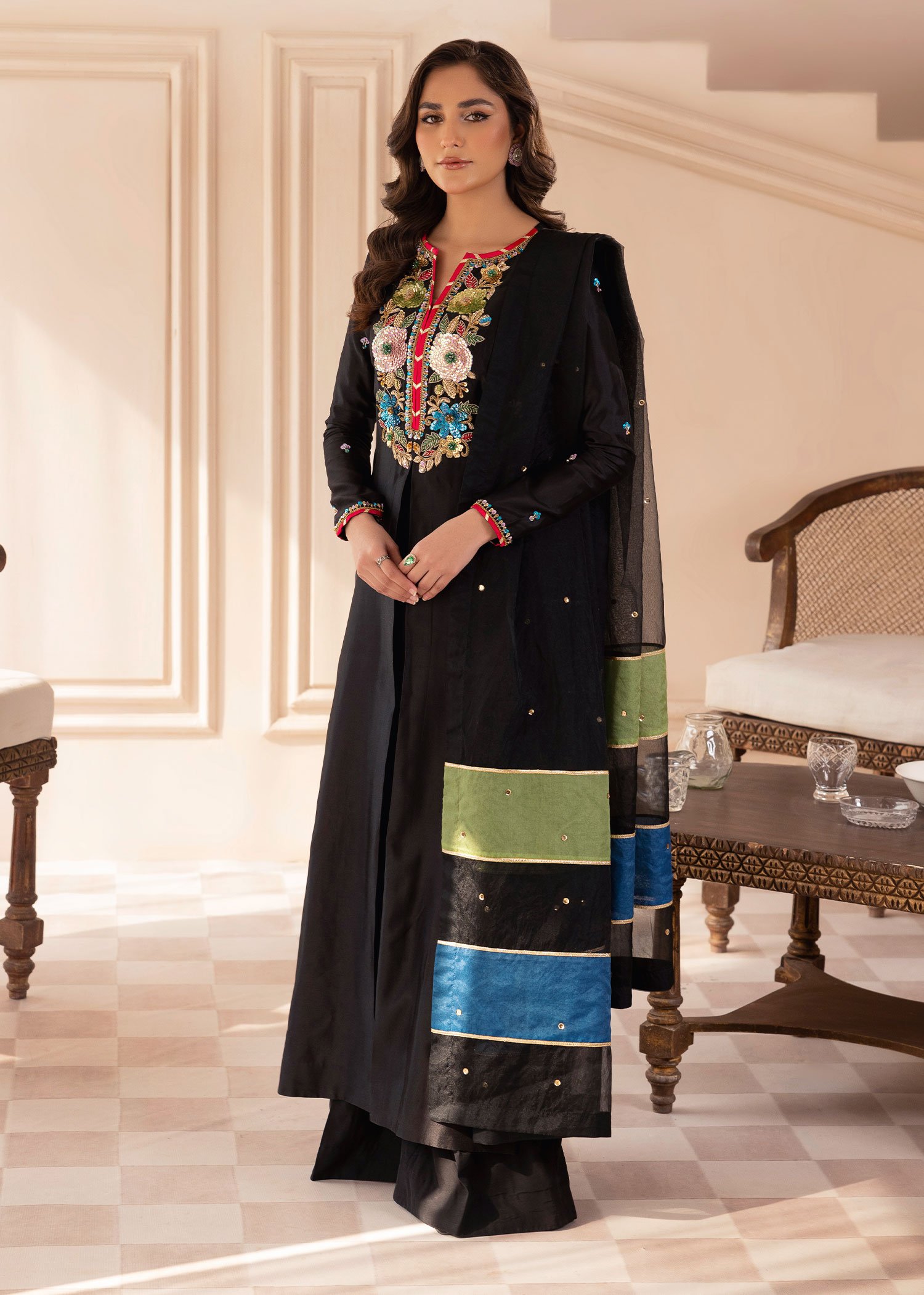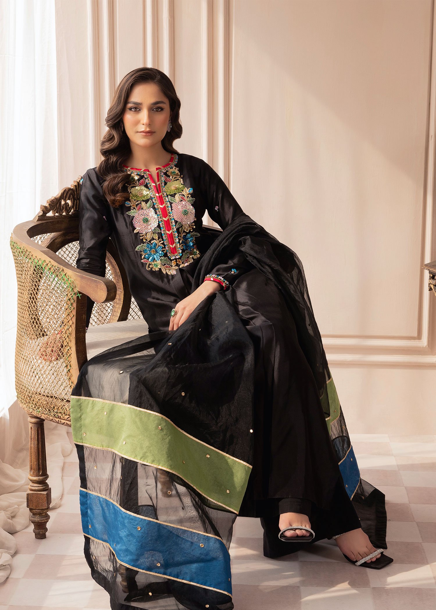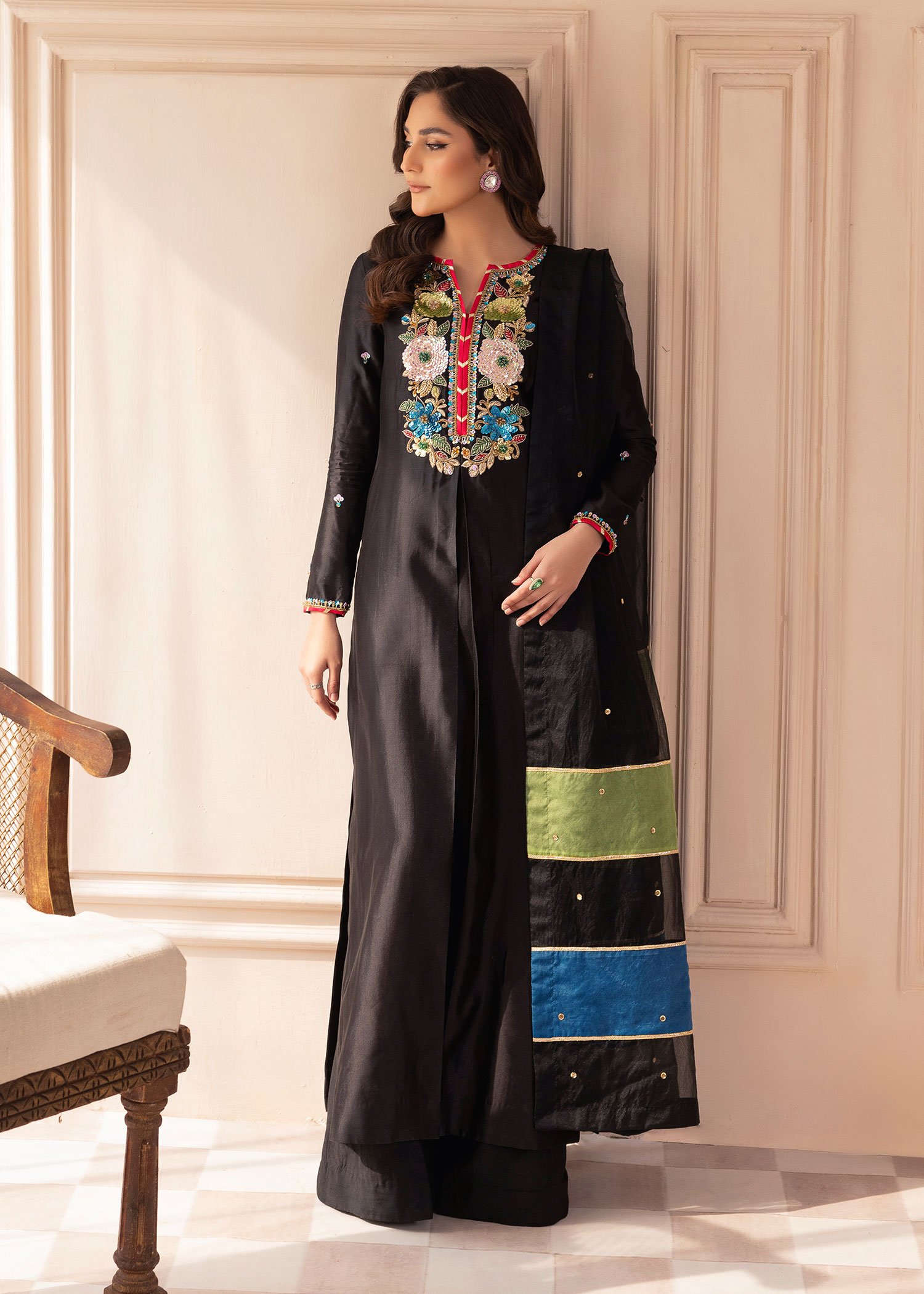 Product Description: Introducing Marjaan, a breathtaking creation that embodies grace and grandeur. Designed to captivate, this ensemble is adorned with intricate hand embellishments, featuring the rich artistry of naqshi and dabka, dazzling sequins, and pearls. Accentuated by a sparkling rhinestone chain and the delicate beauty of resham threads, Marjaan is a perfect blend of tradition and sophistication. Let Marjan be your statement of elegance, crafted for moments that deserve to be cherished forever.