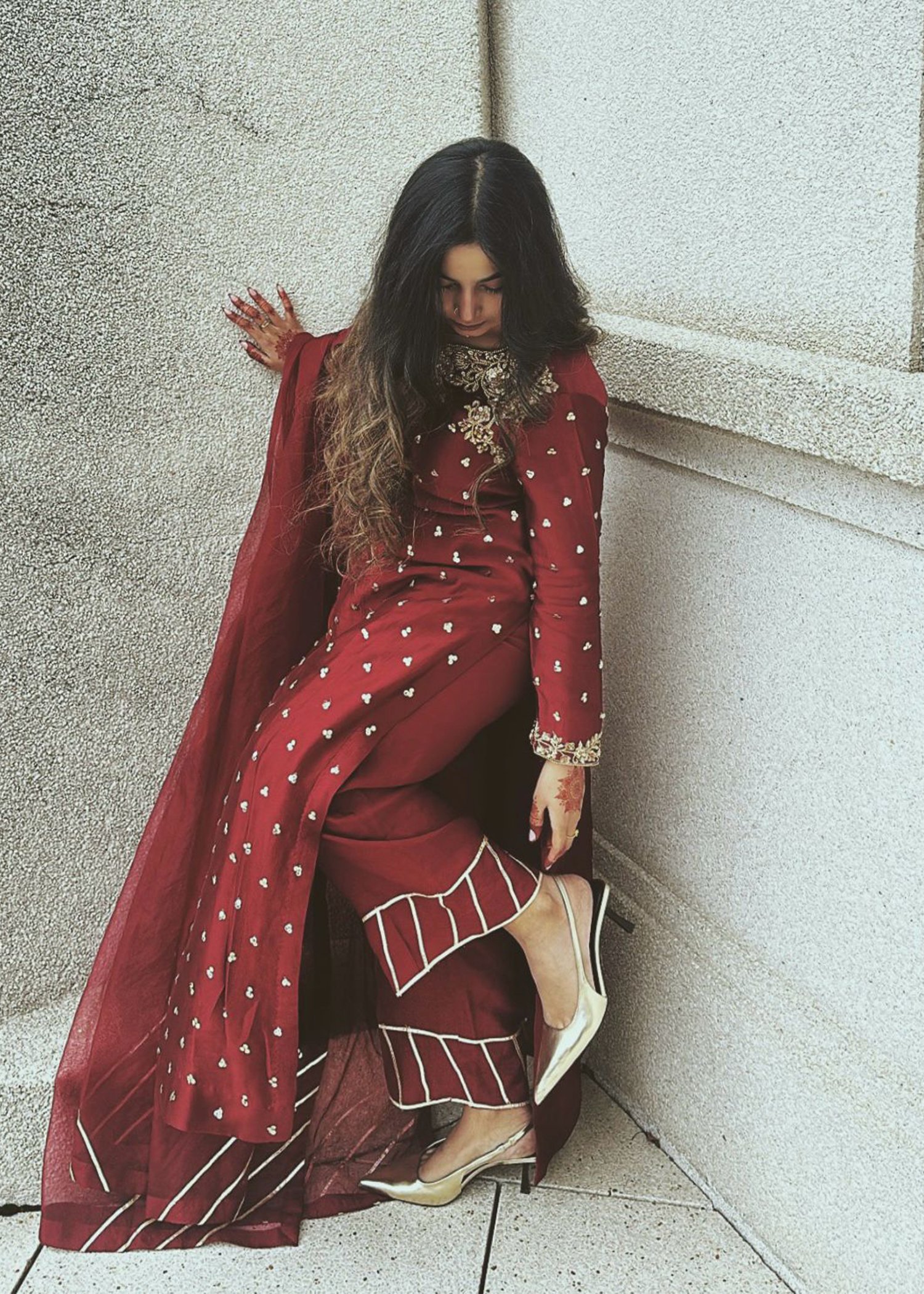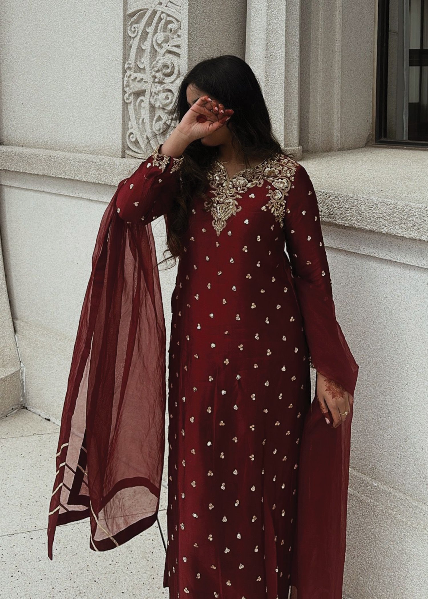 Introducing Zahra, a masterpiece that beautifully blends traditional craftsmanship with modern elegance. This stunning outfit is adorned with exquisite hand embellishments of naqshi, dabka, sequins, pearls, and rhinestone chains, each meticulously applied to create a mesmerizing, intricate design. Zahra is perfect for those who appreciate the art of handwork and desire a statement piece that exudes sophistication and grace. Ideal for special occasions, Zahra effortlessly combines timeless beauty with contemporary allure.