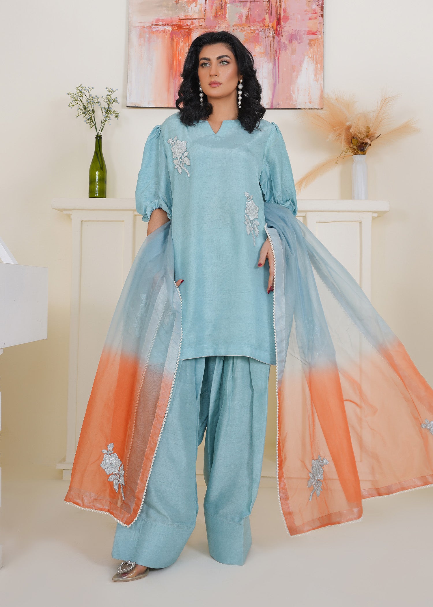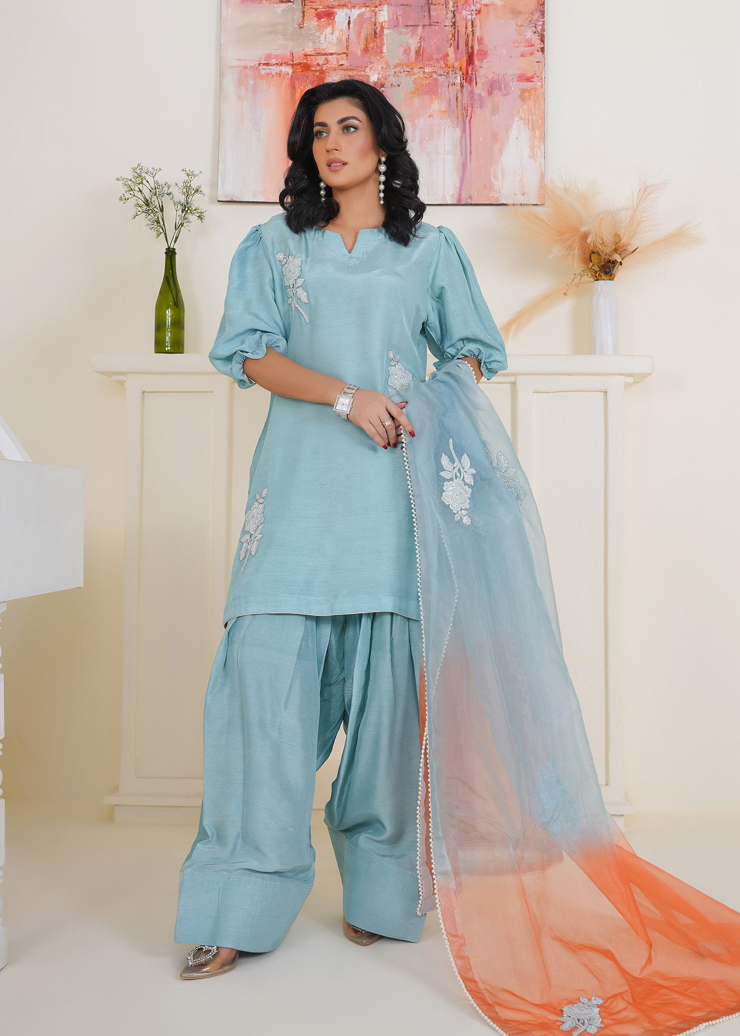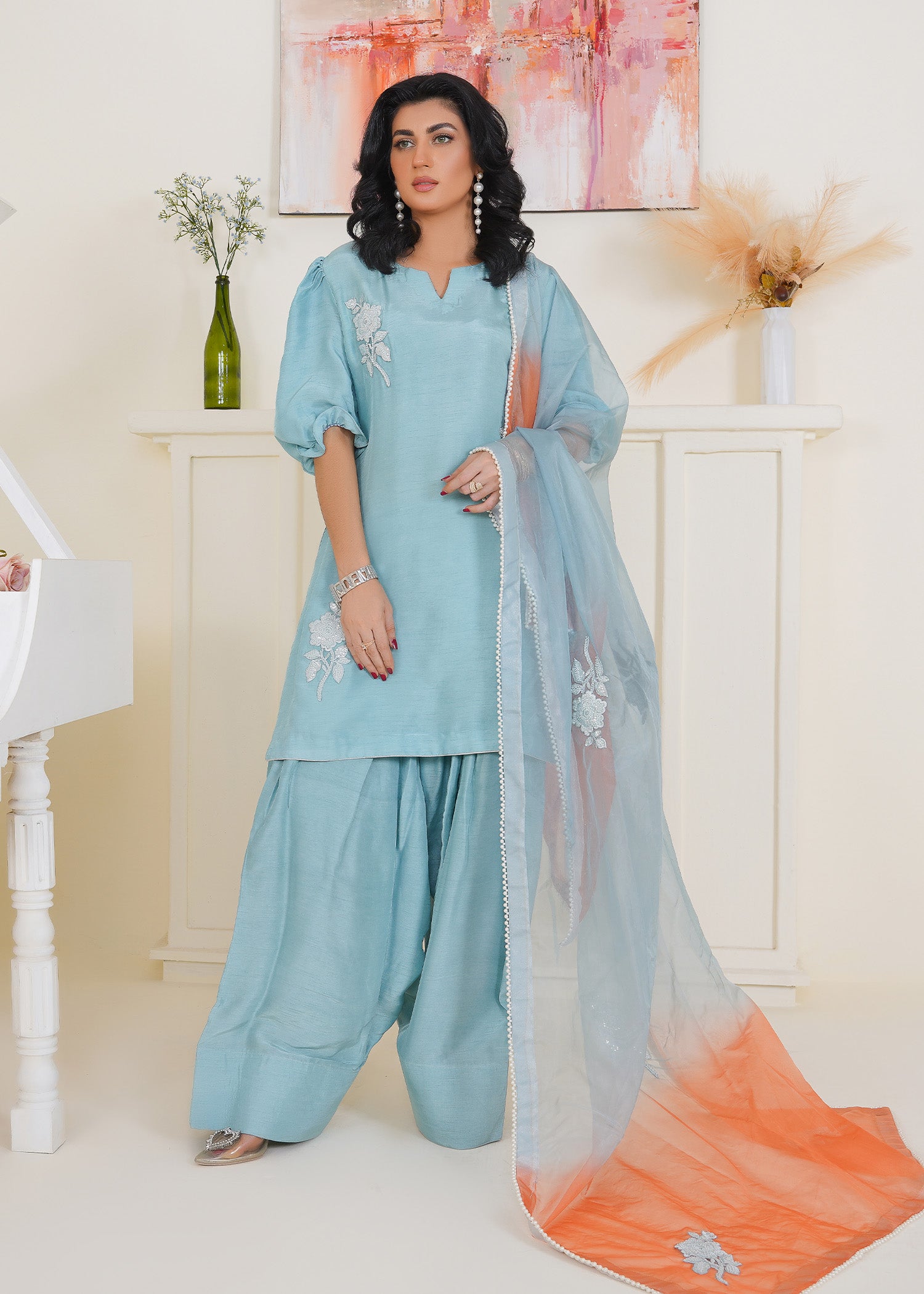 Product Description: Introducing Celestia, a vision of serenity in cool ice blue. This piece combines delicate embroidery and subtle applique work, brought to life with hand-embellished cutdana and sequins. The interplay of textures creates a refined and graceful silhouette that exudes sophistication. Ideal for intimate gatherings or formal celebrations, Ailani whispers luxury through its understated elegance and timeless design.