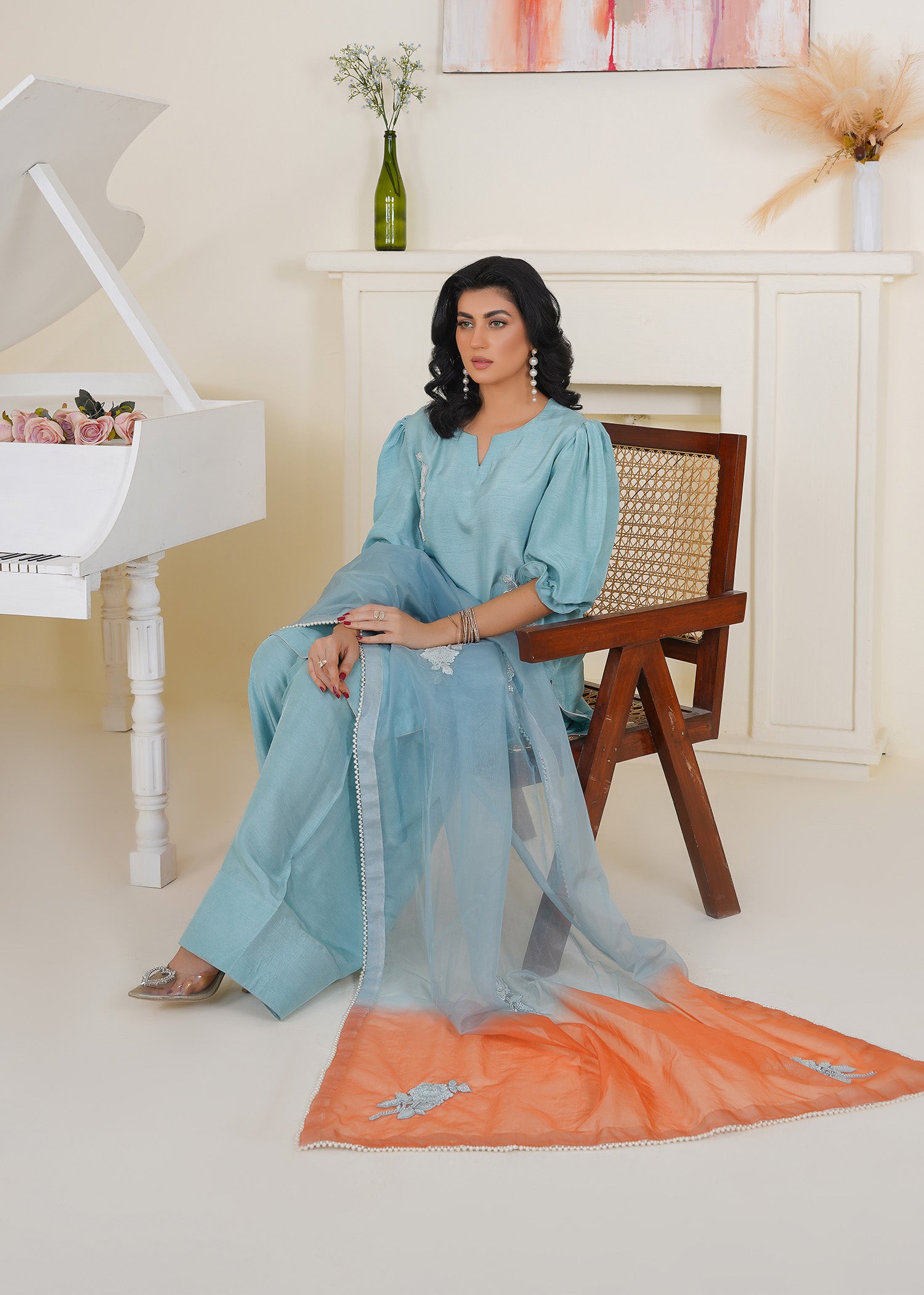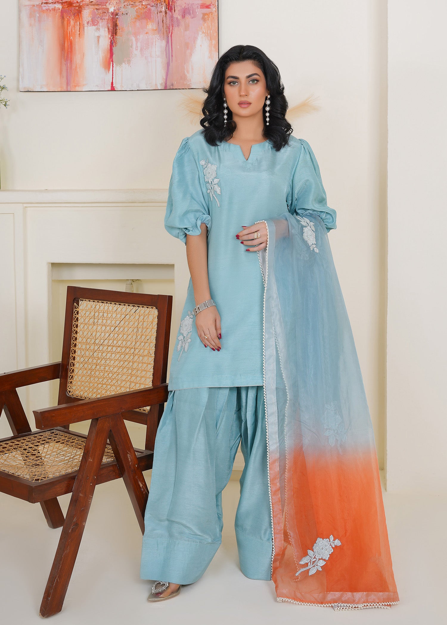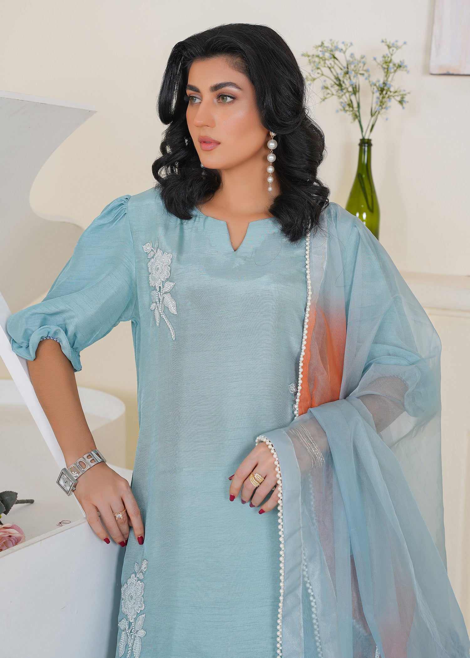 Product Description: Introducing Celestia, a vision of serenity in cool ice blue. This piece combines delicate embroidery and subtle applique work, brought to life with hand-embellished cutdana and sequins. The interplay of textures creates a refined and graceful silhouette that exudes sophistication. Ideal for intimate gatherings or formal celebrations, Ailani whispers luxury through its understated elegance and timeless design.