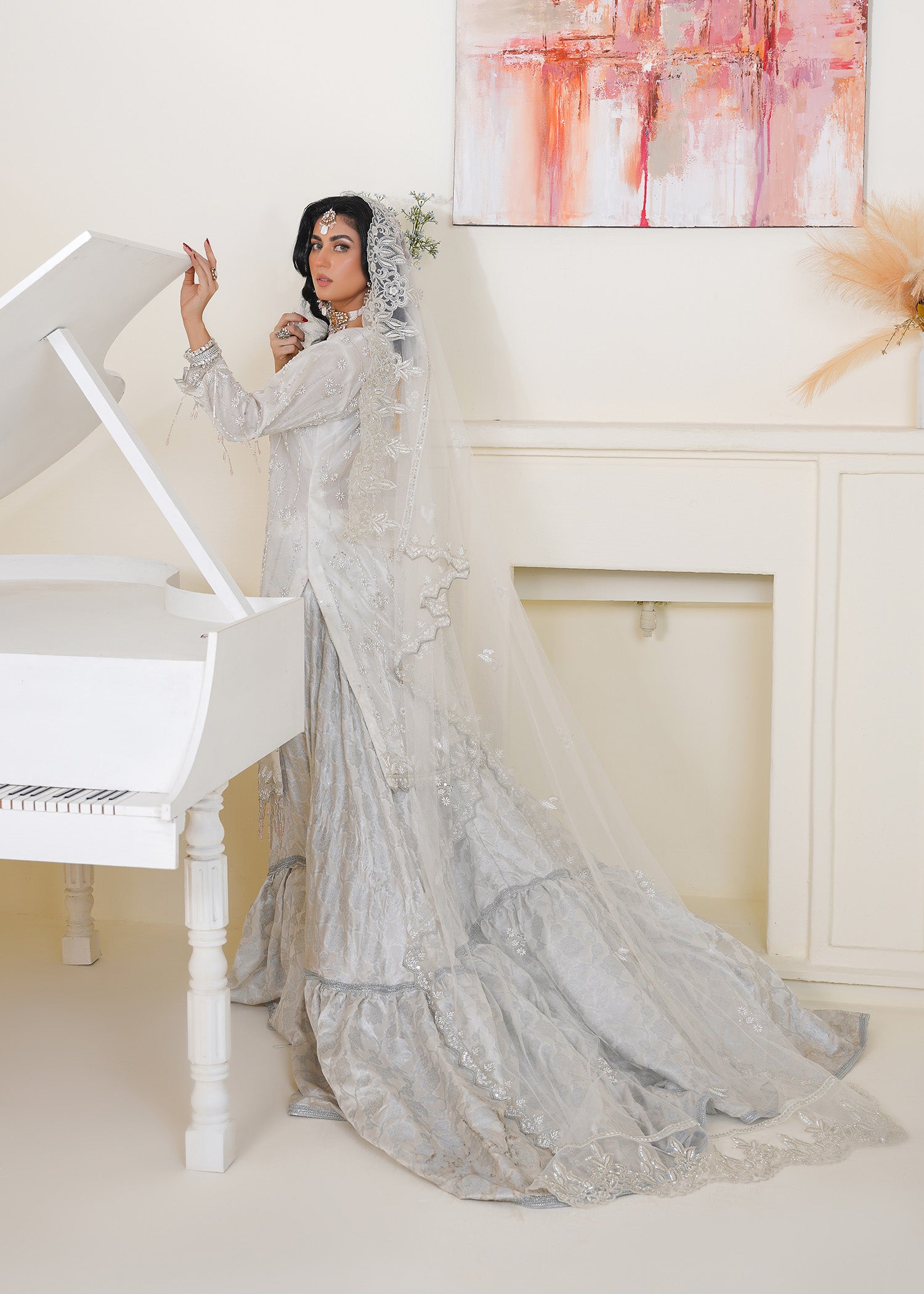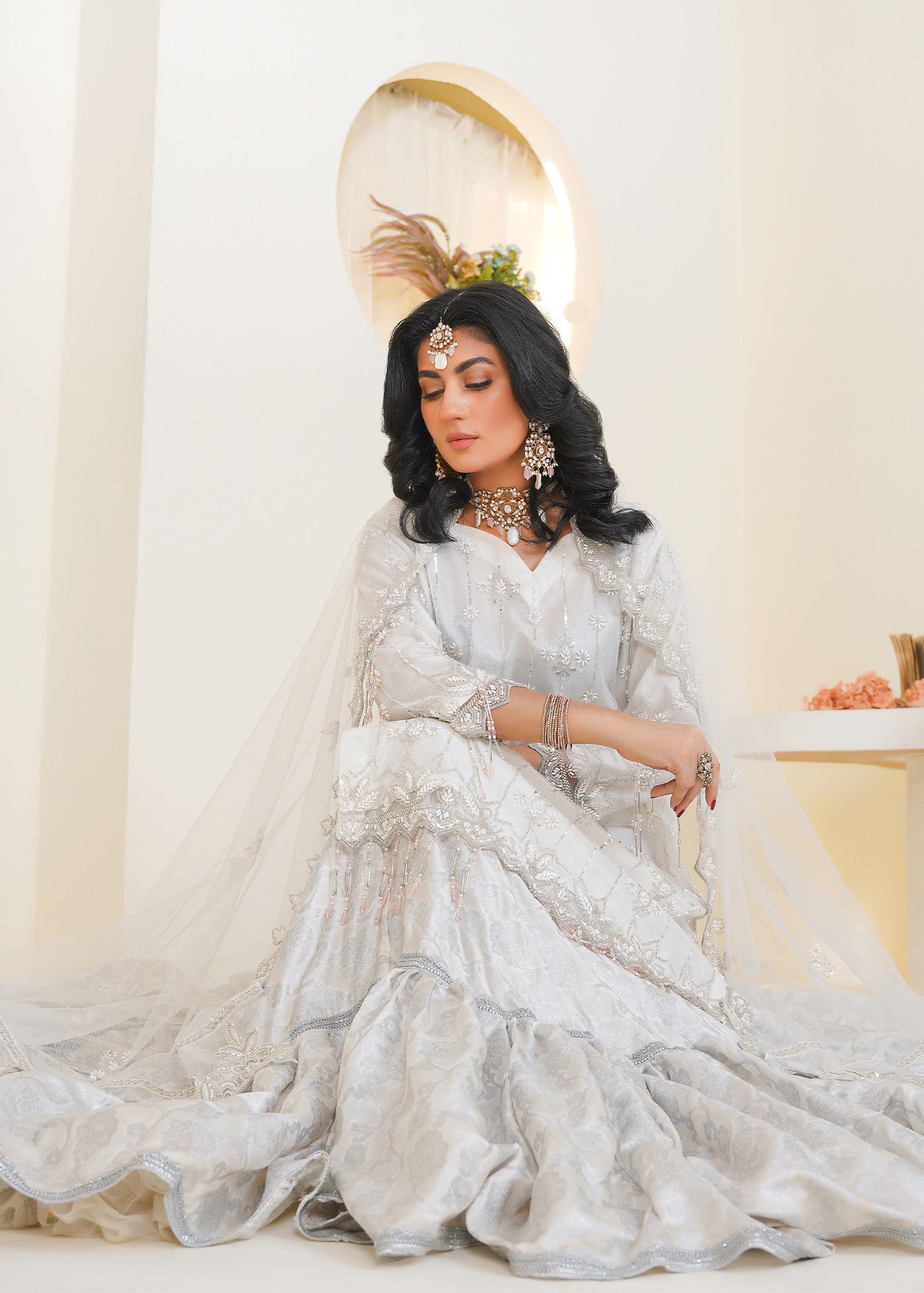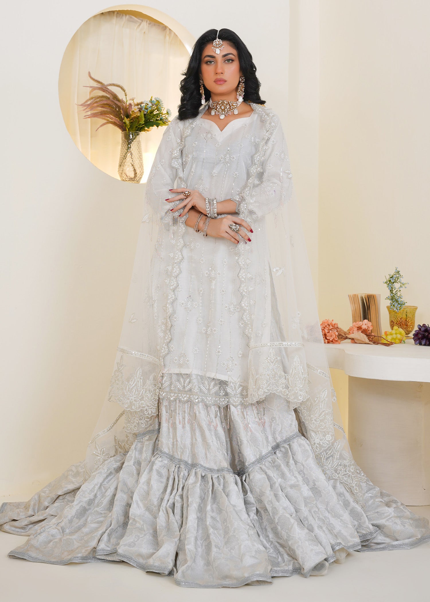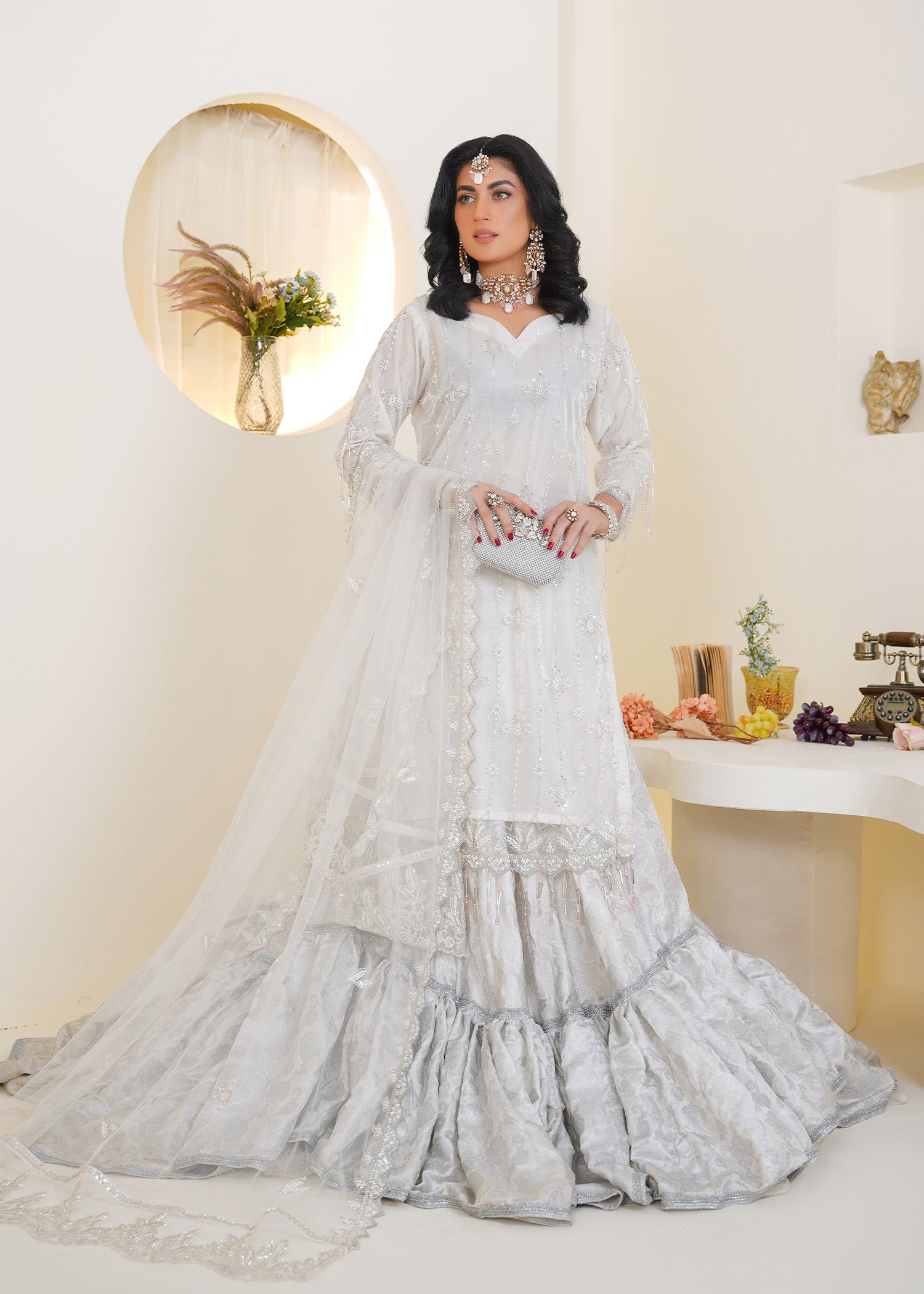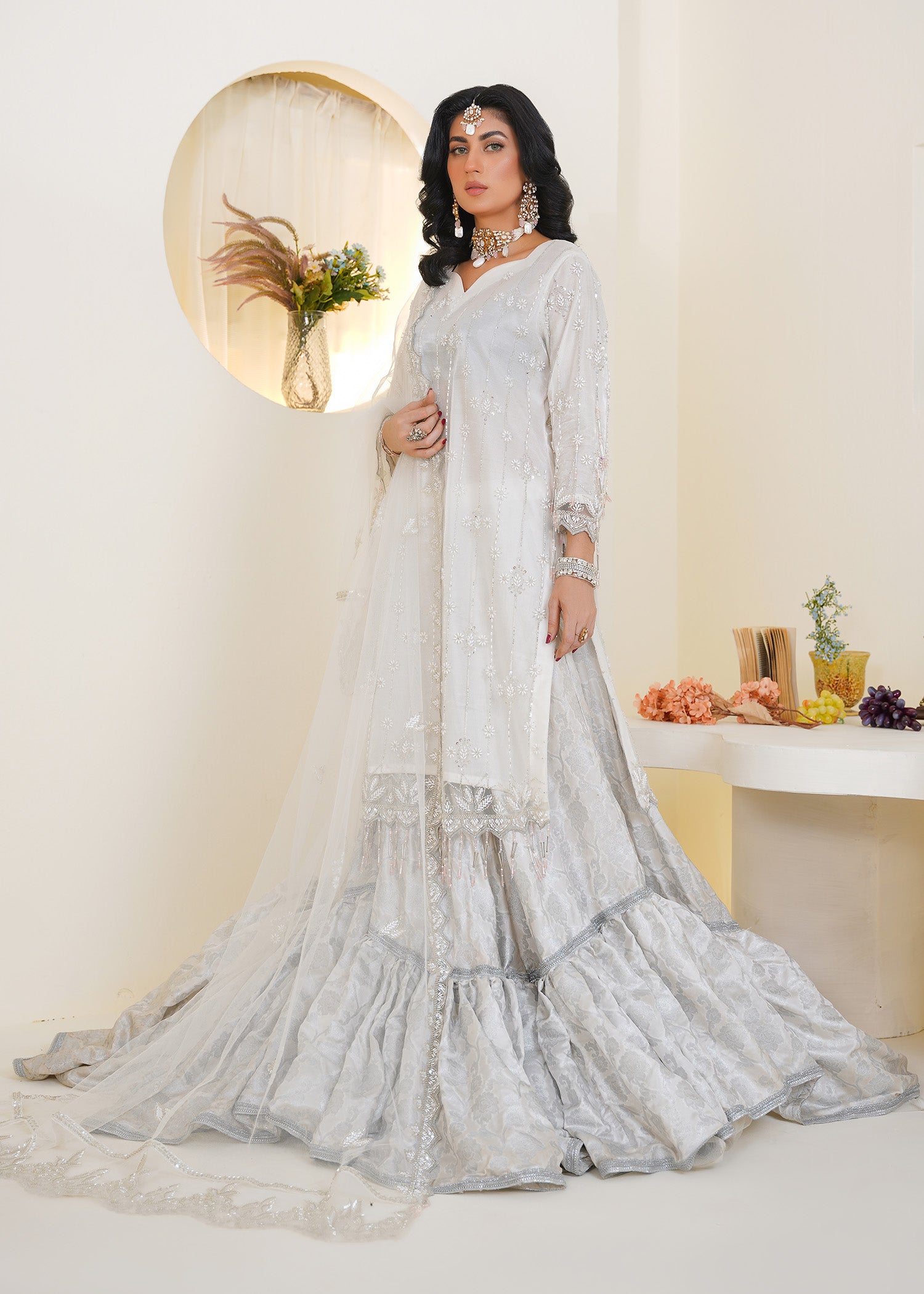 Product Description: Introducing Lyla, a pristine expression of purity and elegance. In timeless white, this ensemble features delicate multihead embroidery and handmade embellishment of crystals, cutdana, and beads. Its clean silhouette and luminous detailing reflect quiet luxury—ideal for festivities, nikkah day, or refined celebrations. Lyla is designed for the modern muse who finds beauty in simplicity and sophistication.