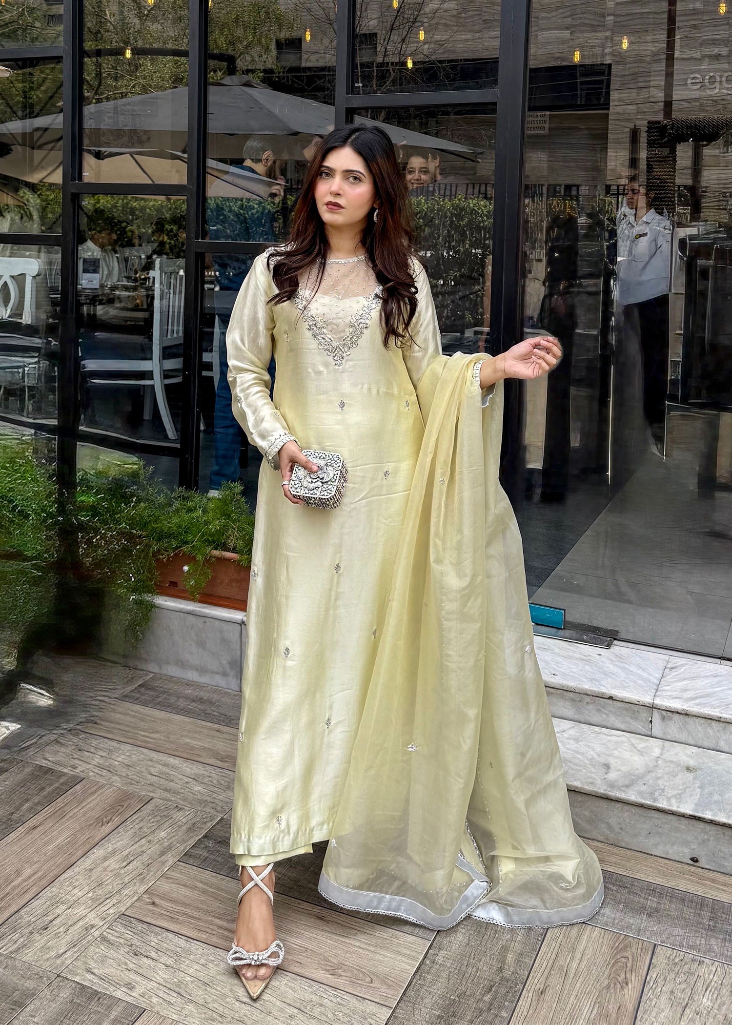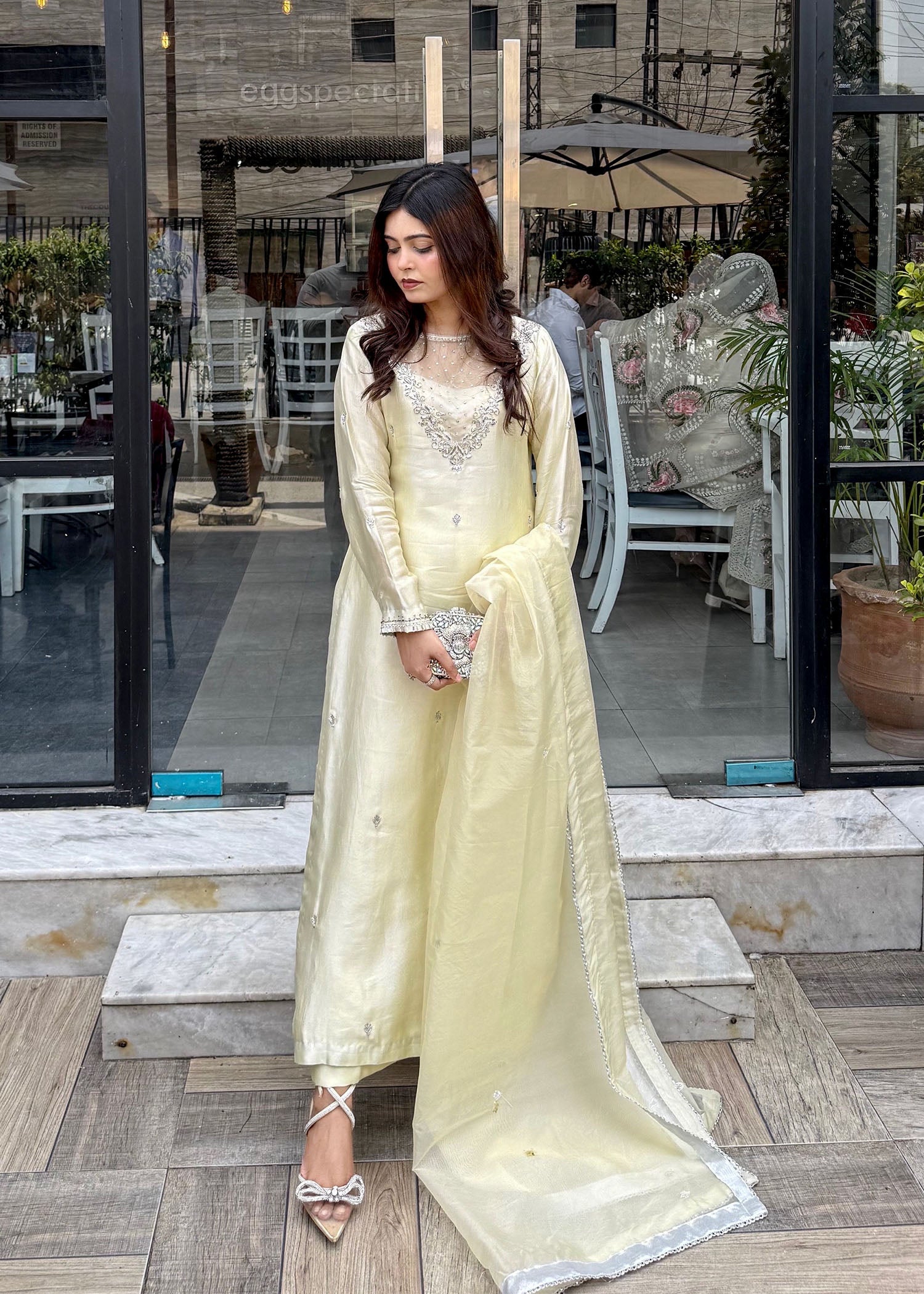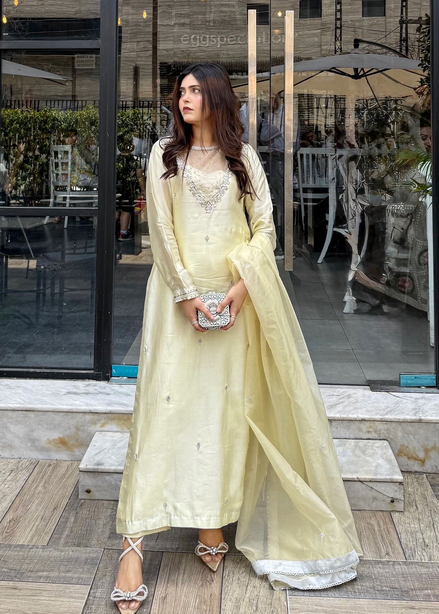 Product Description: Introducing Mahrosh, a sunlit celebration of joy and tradition. Drenched in a vibrant yellow hue, this ensemble is adorned with stunning handmade embellishments of crystals, naqshi, sequins, cutdana, and beads. The meticulous craftsmanship adds depth and radiance, making Mahrosh a perfect pick for festivities, ceremonies, or joyous get-togethers. This design radiates positivity and heritage charm in every thread.