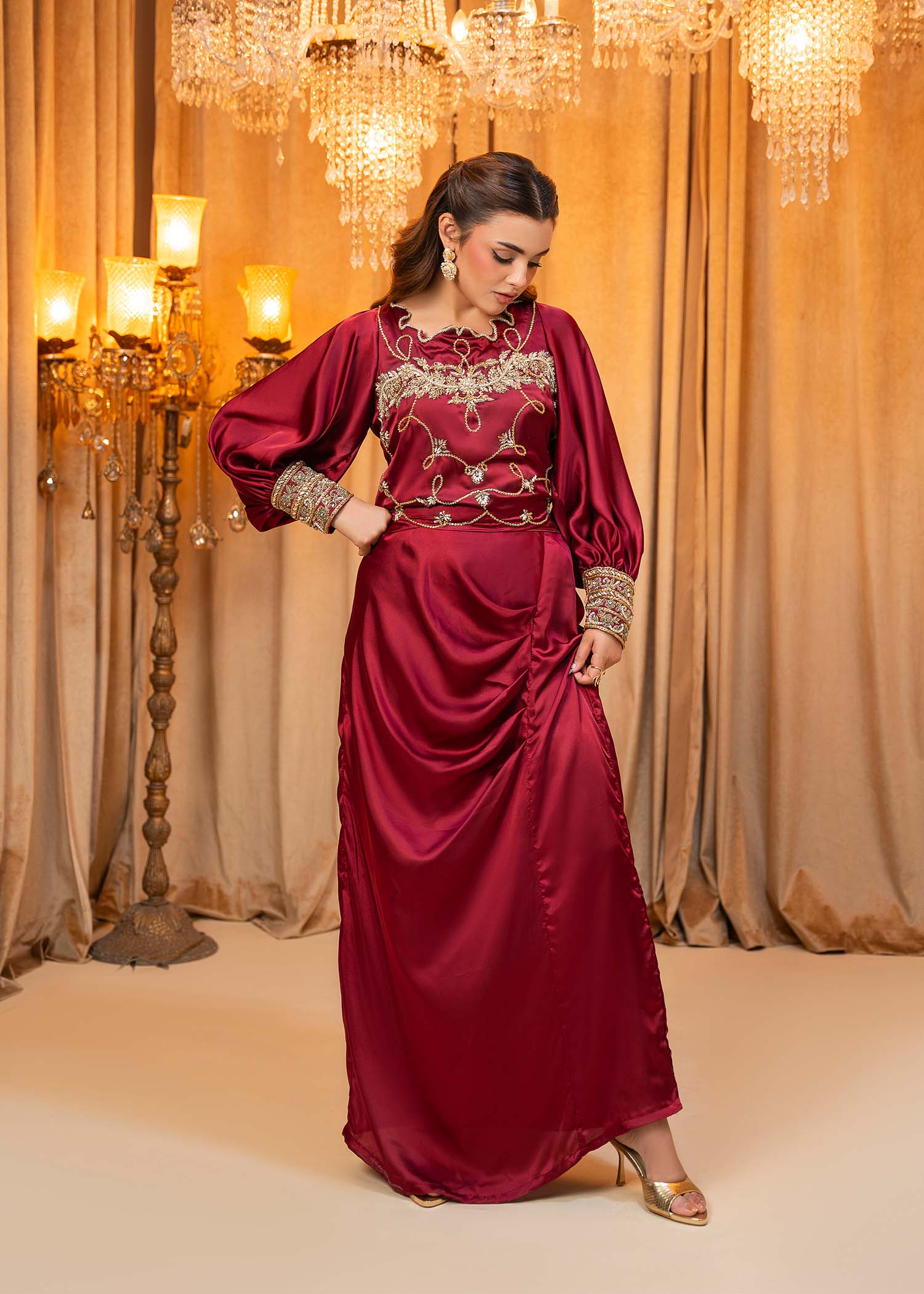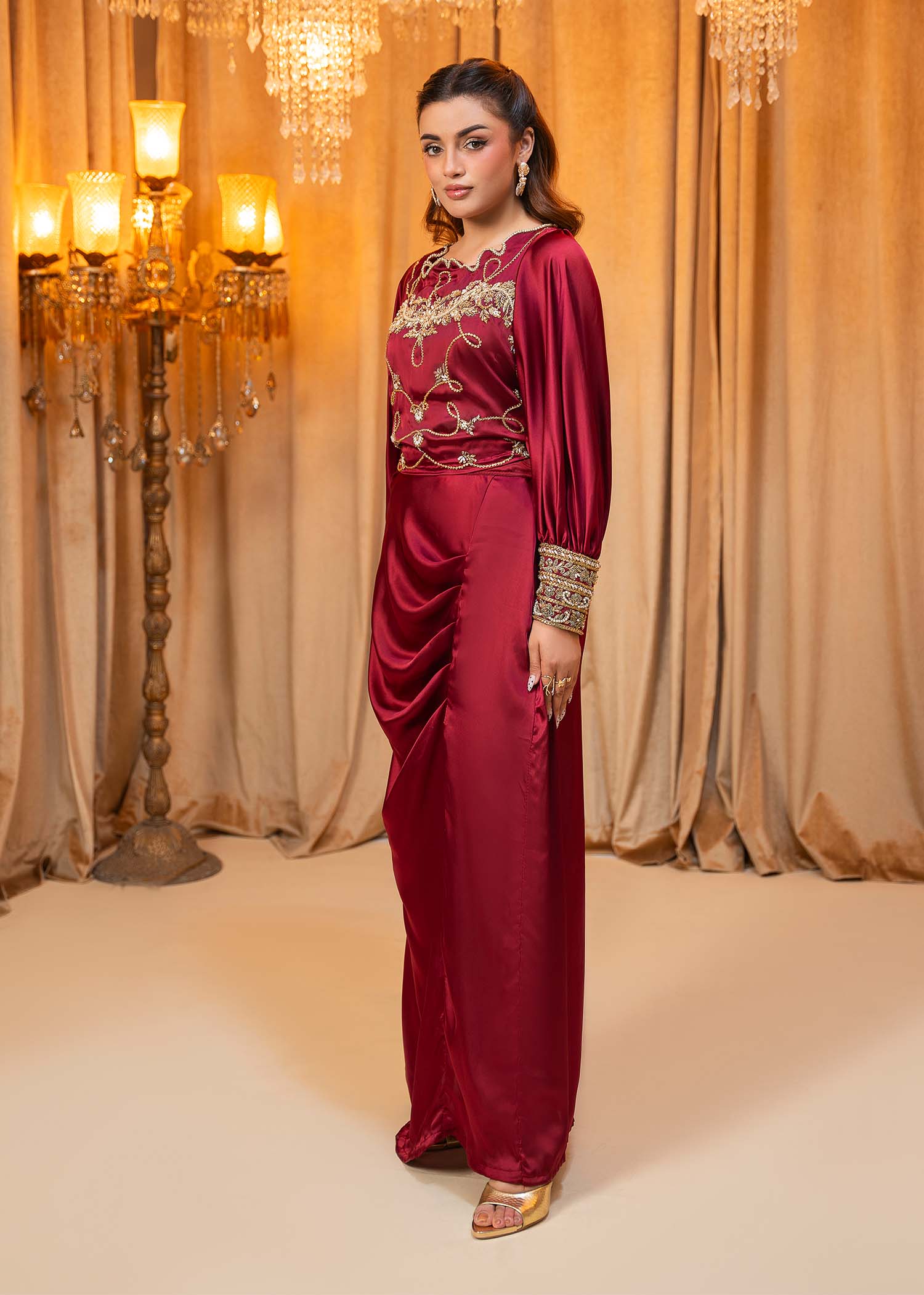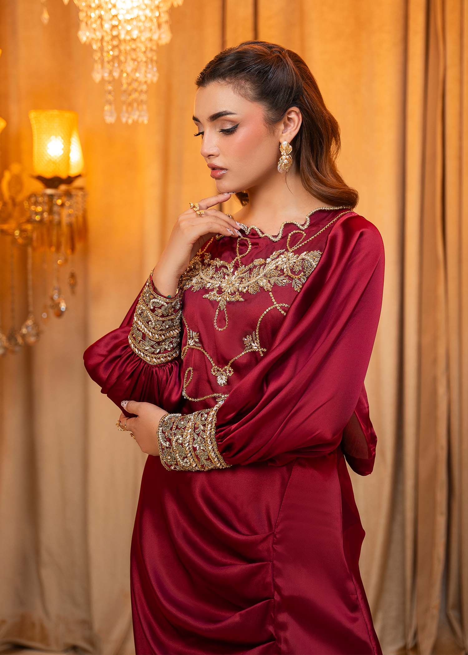 Product Description: Introducing Miran, a regal maroon masterpiece that embodies timeless opulence and tradition. Adorned with exquisite hand-embellished detailing, Miran is designed to make a striking statement at weddings and grand festivities.