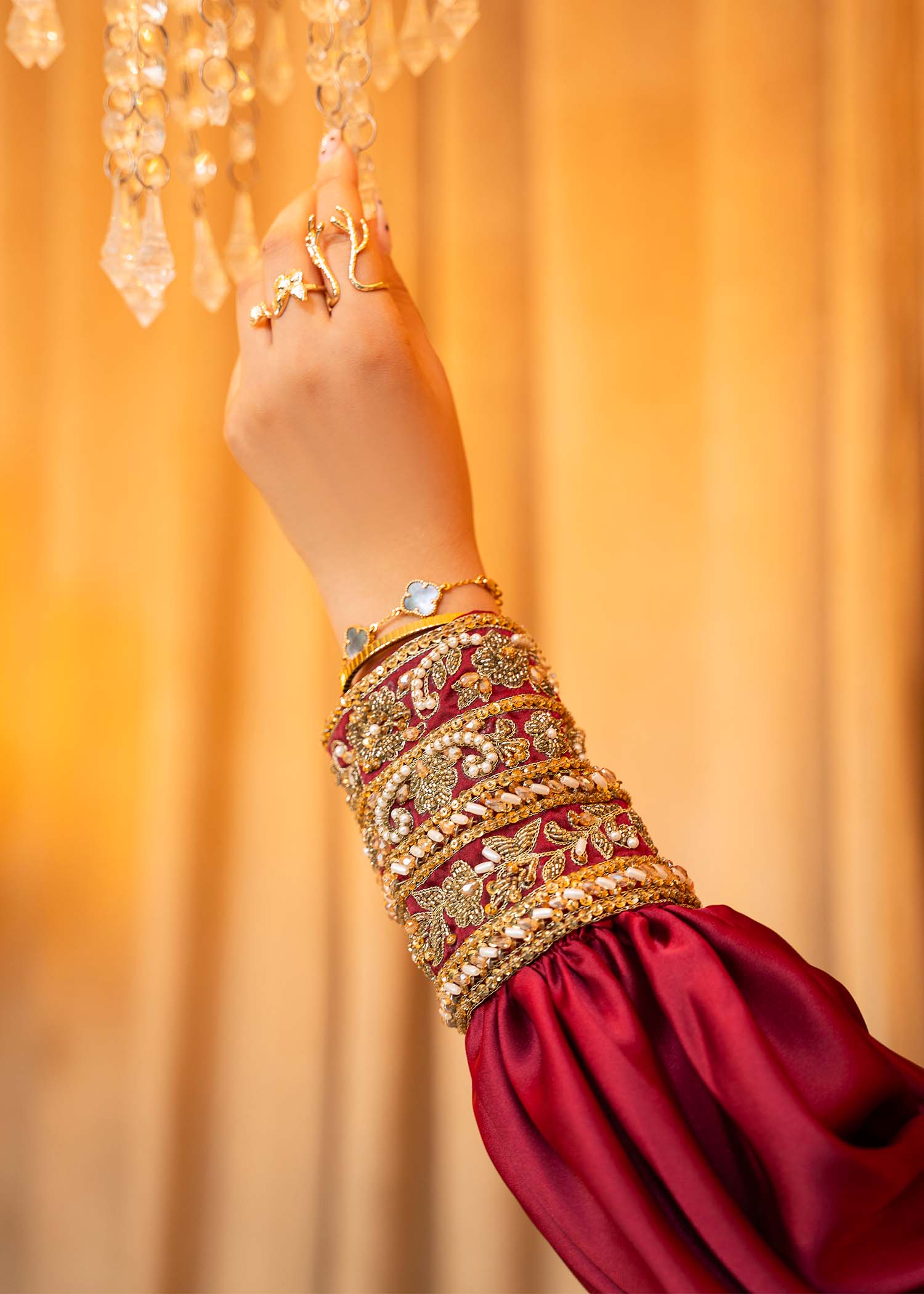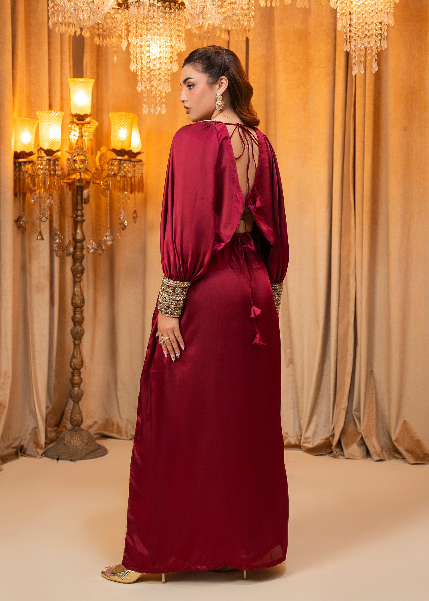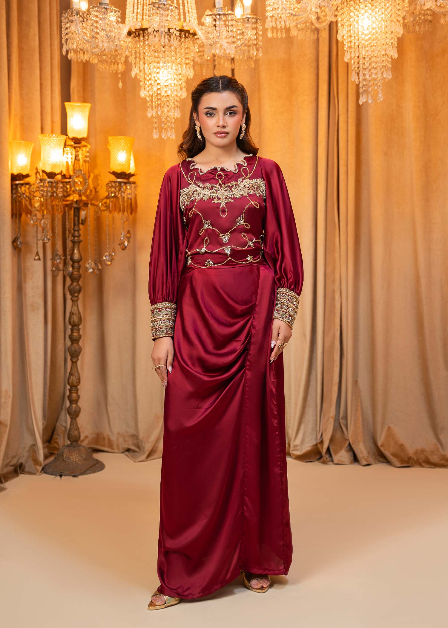 Product Description: Introducing Miran, a regal maroon masterpiece that embodies timeless opulence and tradition. Adorned with exquisite hand-embellished detailing, Miran is designed to make a striking statement at weddings and grand festivities.