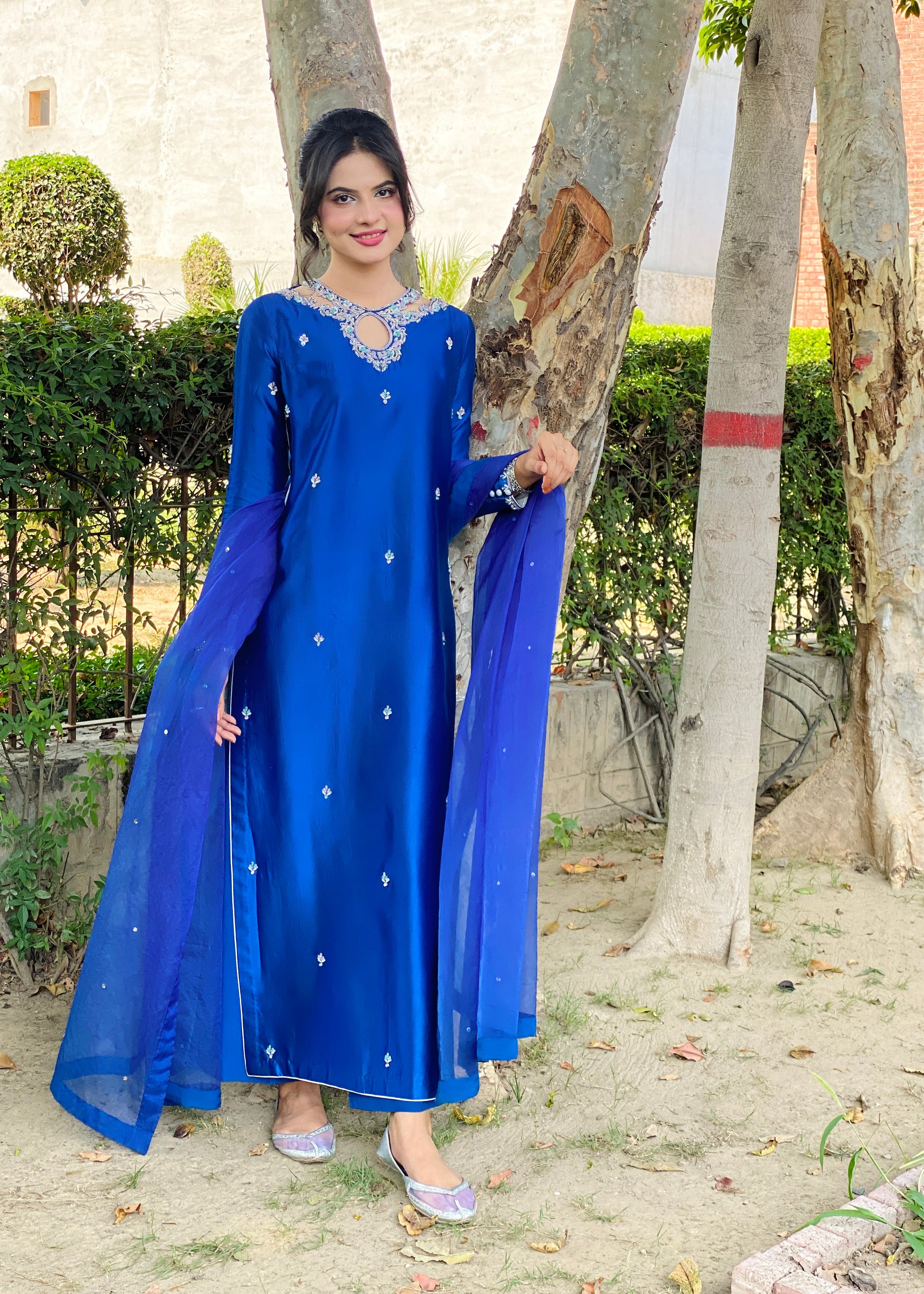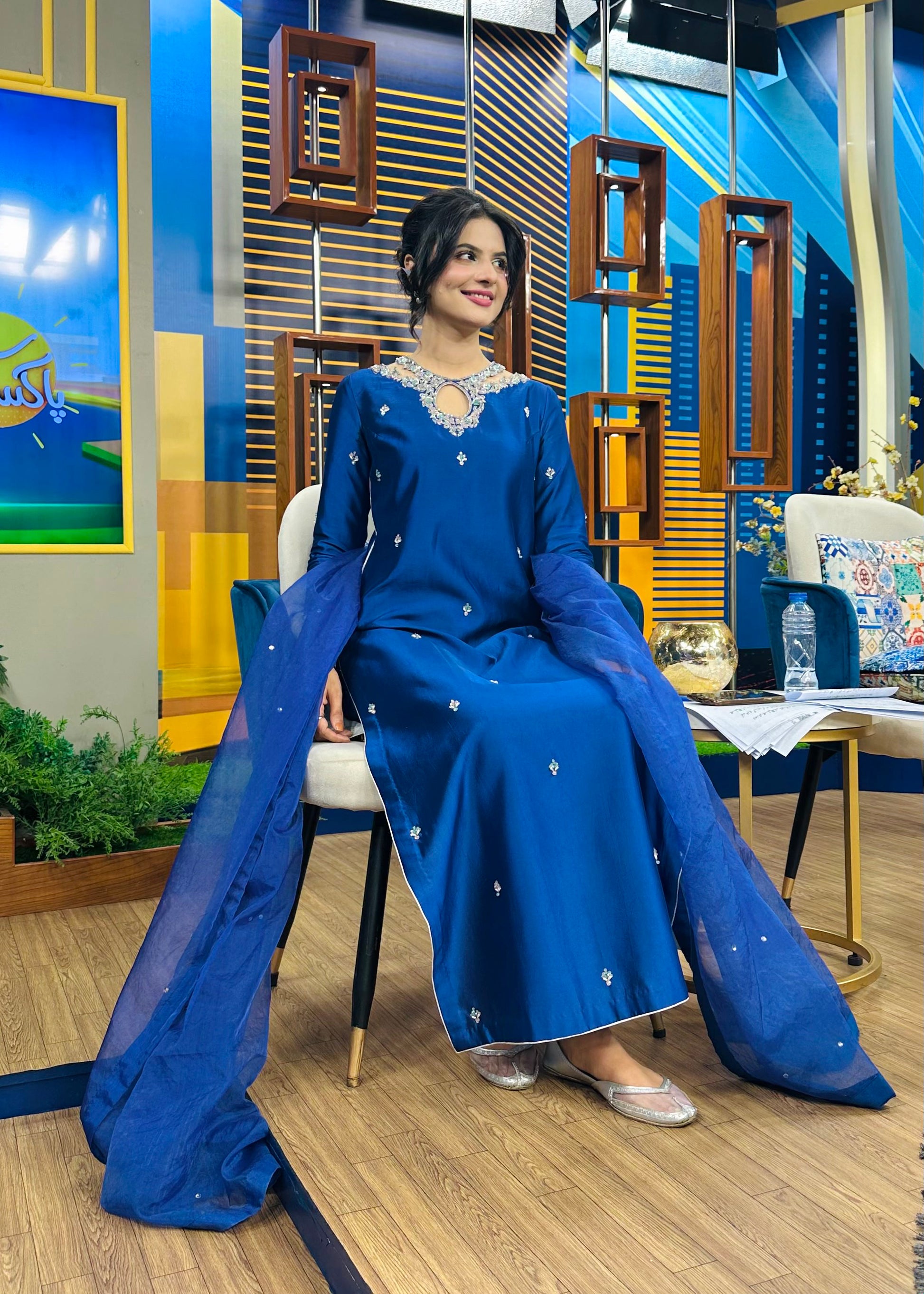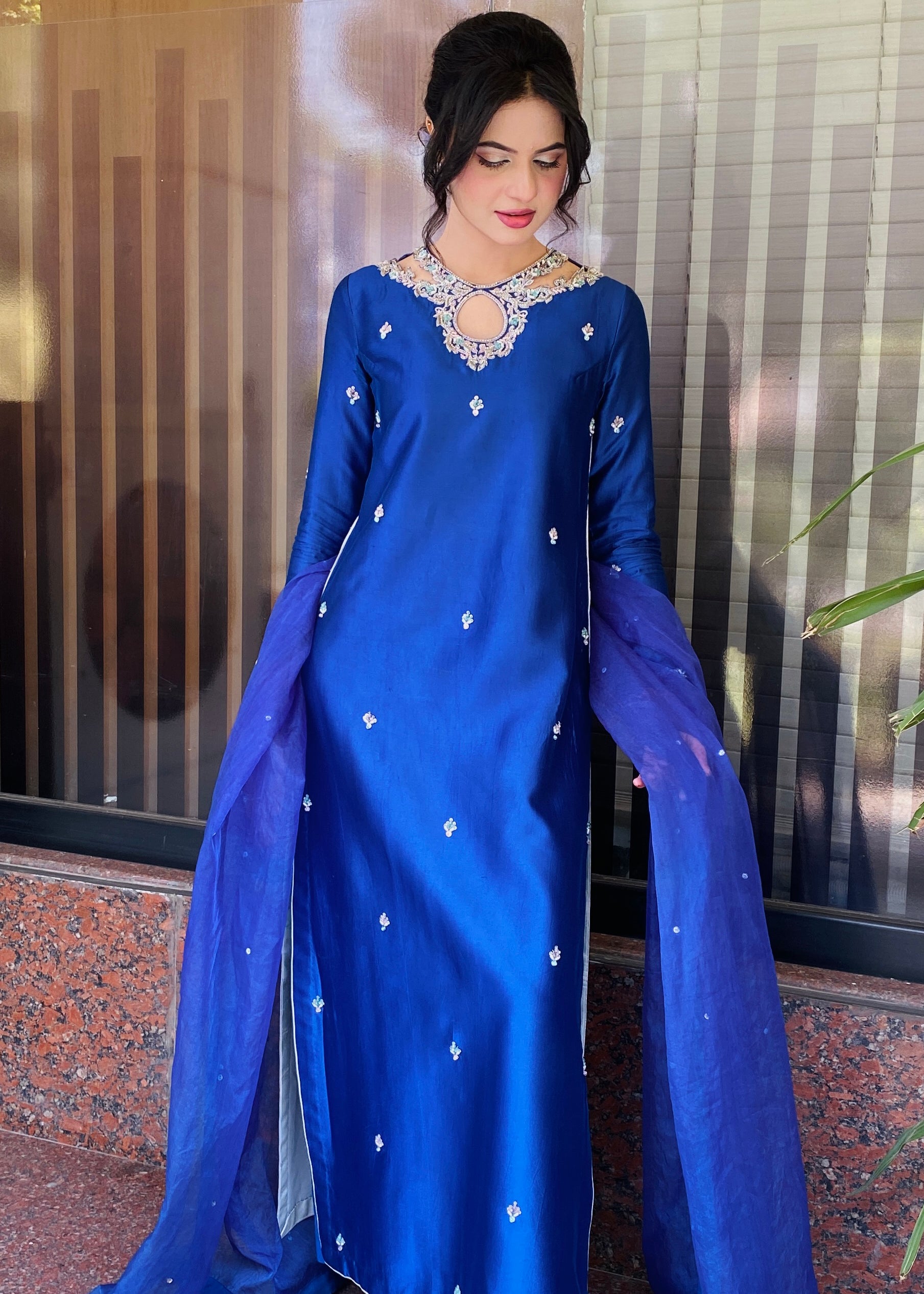 Product Description: Introducing Sapphire, a stunning piece that radiates elegance and timeless beauty. Adorned with intricate hand embellishments of naqshi, dabka, sequins, pearls, and a delicate rhinestone chain, this design is a true masterpiece. The fusion of traditional craftsmanship and modern glamour makes Sapphire the perfect choice for those seeking a luxurious, show-stopping look. Each detail has been carefully crafted to add a touch of sophistication and sparkle, ensuring you shine with every step you take. Whether for a special occasion or a memorable evening, Sapphire is your key to unforgettable style.