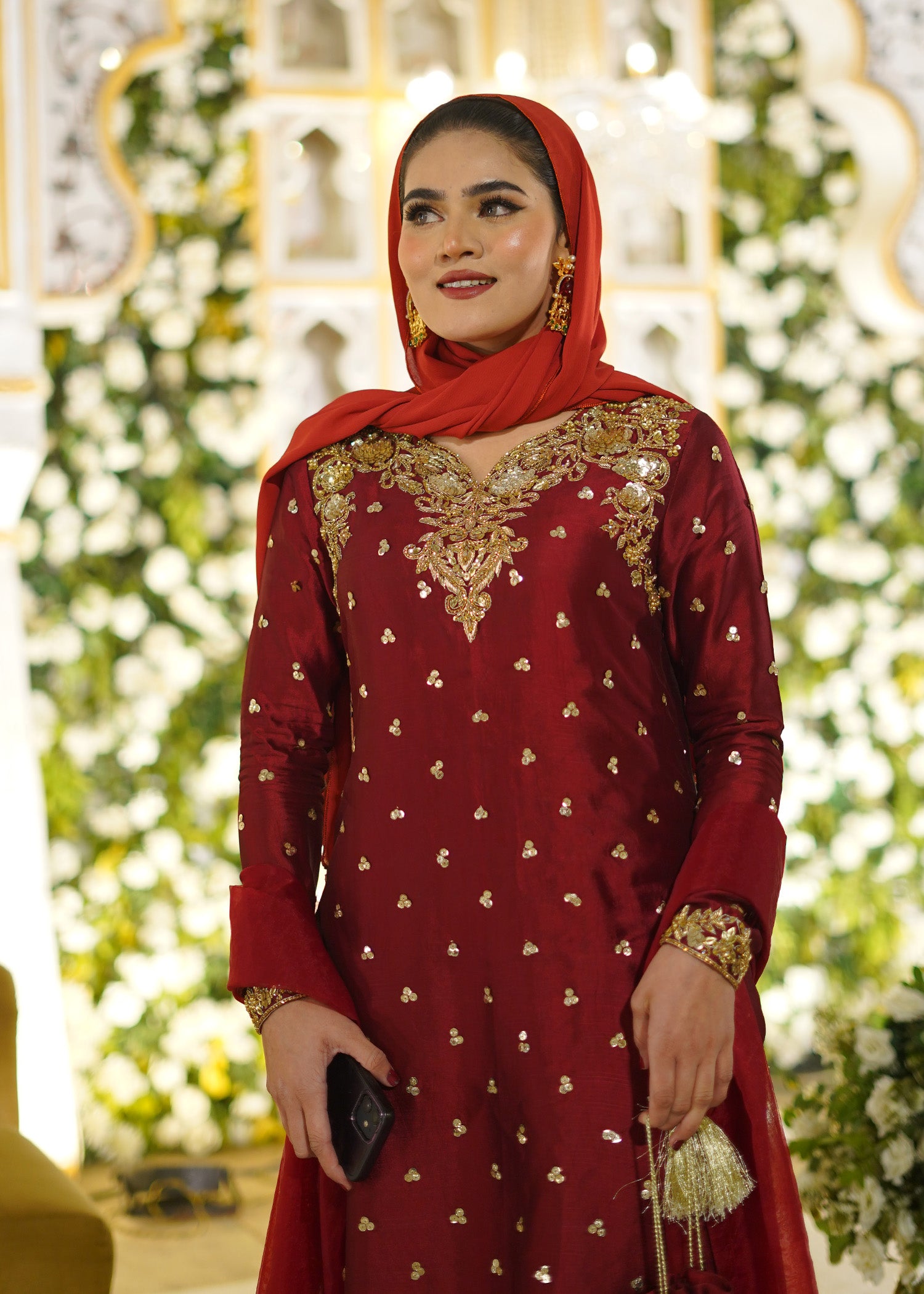 Introducing Zahra, a masterpiece that beautifully blends traditional craftsmanship with modern elegance. This stunning outfit is adorned with exquisite hand embellishments of naqshi, dabka, sequins, pearls, and rhinestone chains, each meticulously applied to create a mesmerizing, intricate design. Zahra is perfect for those who appreciate the art of handwork and desire a statement piece that exudes sophistication and grace. Ideal for special occasions, Zahra effortlessly combines timeless beauty with contemporary allure.