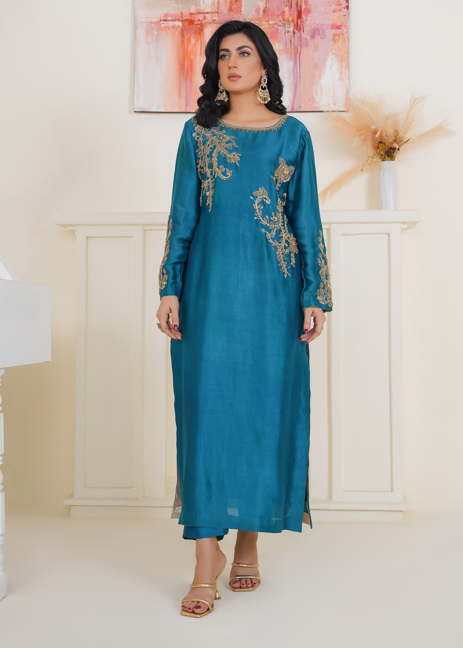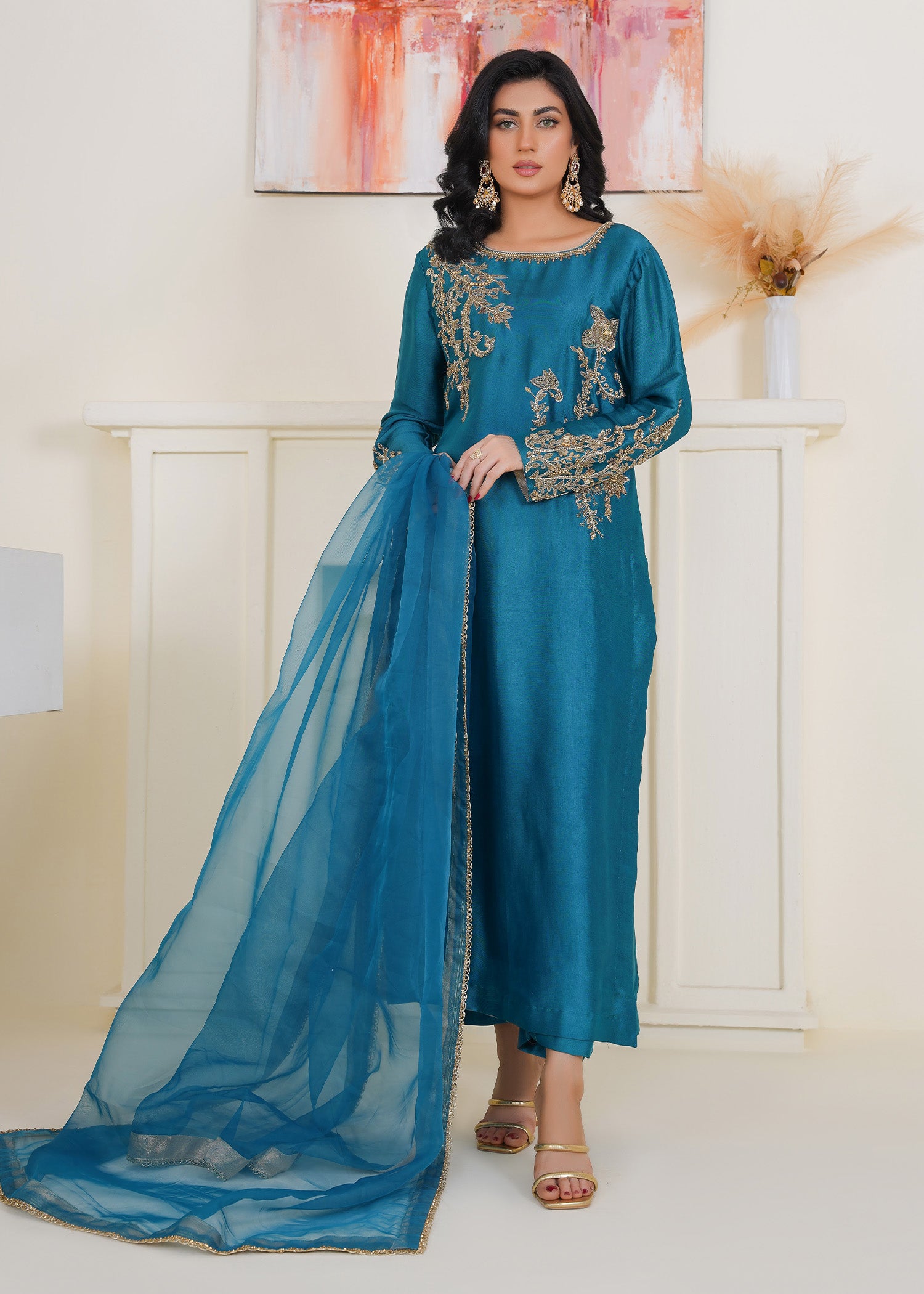 Product Description: Introducing Zayra , a bold and sophisticated ensemble that speaks volumes with its deep jewel-toned palette. Hand-embellished with radiant crystals, dabka, sequins, rhinestone chains, cutdana, and intricate beads, Zayra balances grandeur with finesse. The rich detailing adds dimension and brilliance, making it an impeccable choice for evening wear and celebratory affairs where elegance meets modern allure.