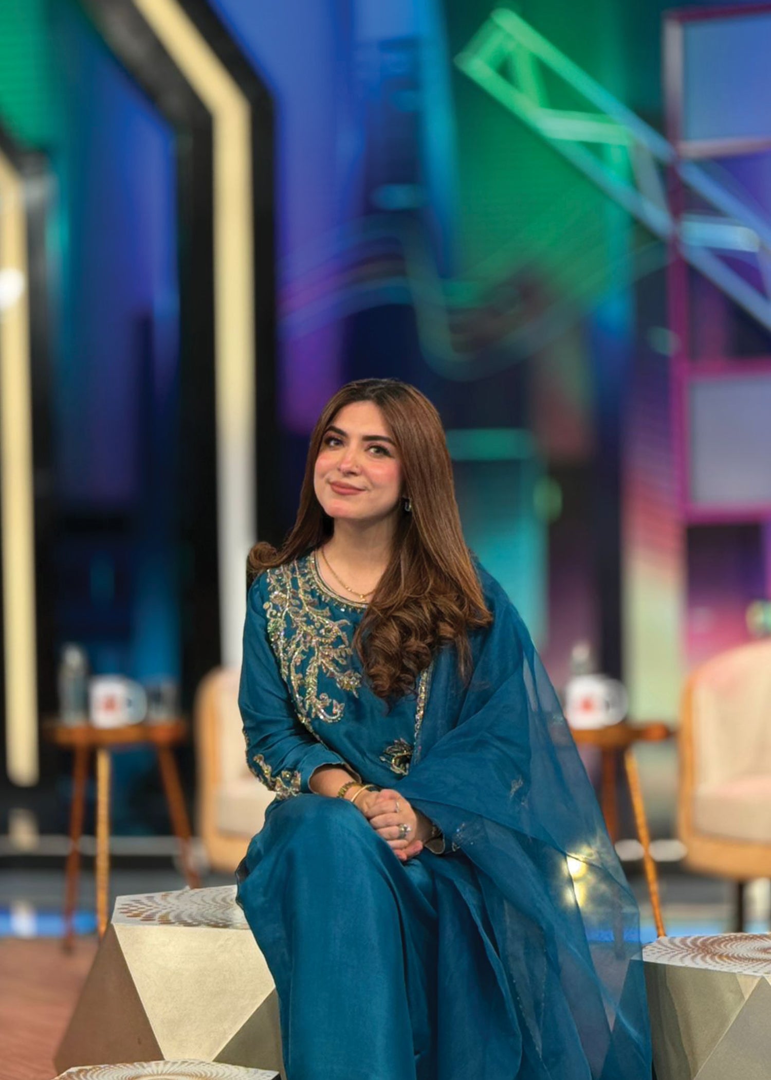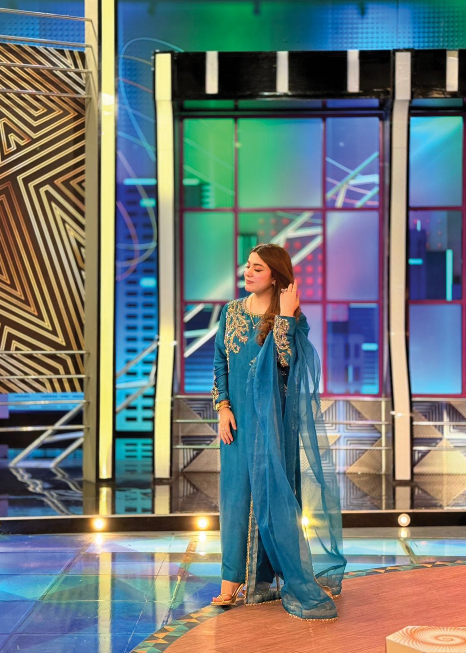 Product Description: Introducing Zayra , a bold and sophisticated ensemble that speaks volumes with its deep jewel-toned palette. Hand-embellished with radiant crystals, dabka, sequins, rhinestone chains, cutdana, and intricate beads, Zayra balances grandeur with finesse. The rich detailing adds dimension and brilliance, making it an impeccable choice for evening wear and celebratory affairs where elegance meets modern allure.